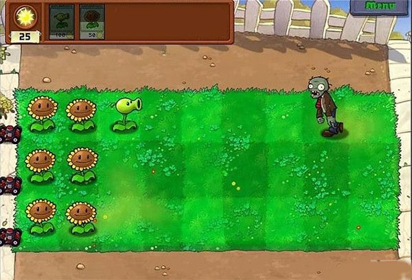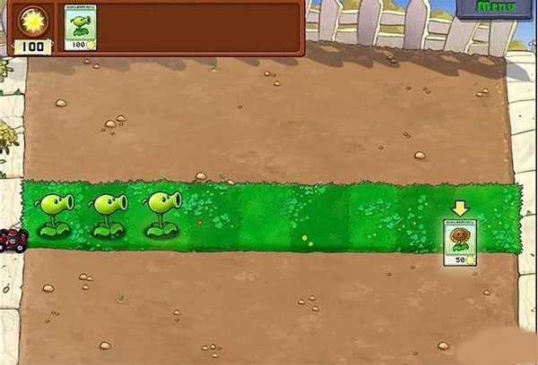 此关属于教程关,僵尸来路只有1条。收集太阳并种好豌豆射手就可以了,不过别把豌豆射手种在右边僵尸出现的地方自杀就可以轻松过关。