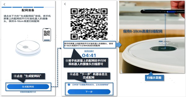 点击“生成配网码”后,请将手机屏幕上的二维码平行对准机器人的摄像头(室内光线/手机屏幕不能太暗)再点击“下一步”听到“扫描配网码成功,正在连接网络”代表扫描成功,显示配网中等待配网结果即可。