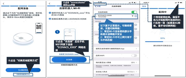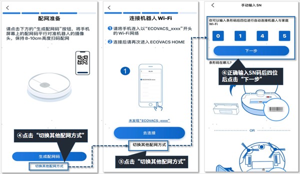 b:点击“切换其它配网方式”手动输入SN码后四位后点击“下一步”后app界面会提示“Ecovacshome”想要加入无线局域网”Ecovacs_xxx”吗?选择加入后机器会自动完成配网。