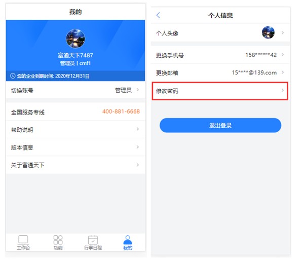 点击下方导航栏的【我的】按钮,在个人界面点击头像后,进入个人信息界面,然后选择【修改密码】进行密码修改。