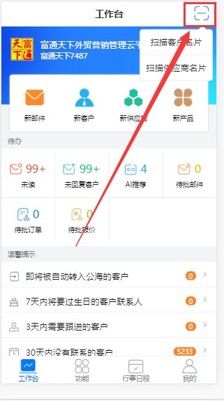 APP首页右上角,点击后可以选择【扫描客户名片】和【扫描供应商名片】。