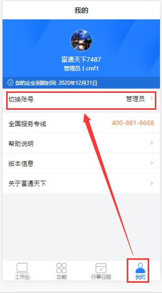 点击下方导航栏的【我的】按钮,然后点击【切换账号】就可以切换到子账号。