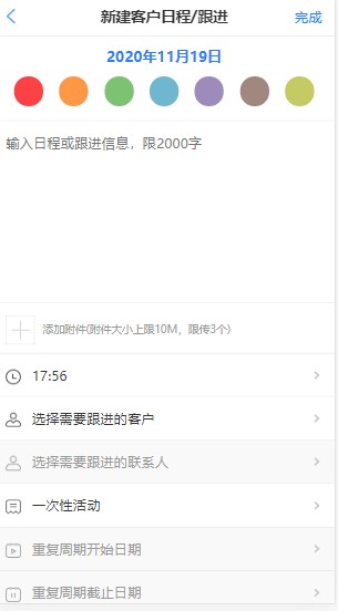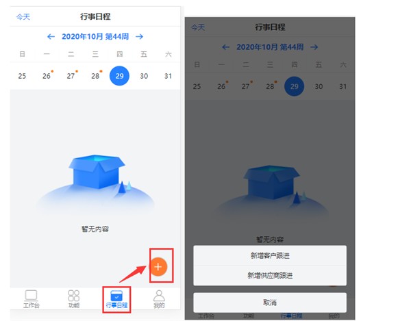 点击下方导航栏的【行事日程】按钮,在行事日程界面选择完日期后,点击【+】按钮,选择【客户跟进】或【供应商跟进】,然后就可以创建跟进/日程了。