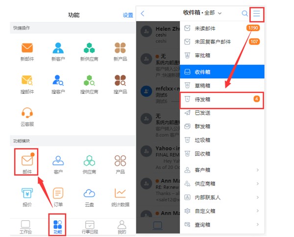 点击下方导航栏的【功能】按钮,在功能界面选择邮件模块后,点击右上角按钮,选择【待发箱】找到相应邮件,在邮件详情界面,点击【发送】按钮即可。