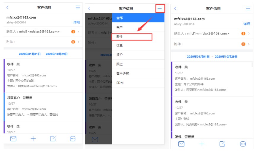 在客户详情界面,点击右上角按钮,选择【邮件】选项后,客户时间轴上显示的是该时间范围内所有的邮件记录。