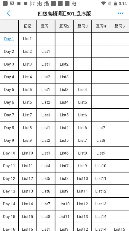 答:每个Day的学习由`记忆`和`复习`两部分组成,Day2里有List2记忆和List1复习,两个都完成“打卡”,顶部的向右箭头就可以点击,切换到Day3。