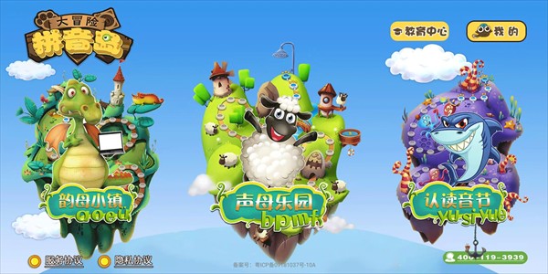 1、打开拼音岛大冒险APP,在首页提供了韵母小镇、声母乐园、认读音节三大模块;