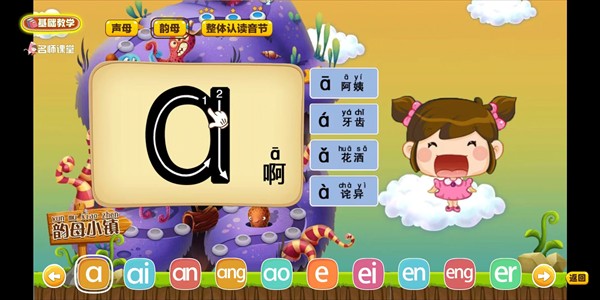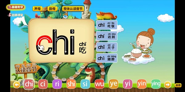 教学以动画的形式进行。 每节都有拼音和相应的新字识读。 结合笔画和发音,快速学会拼音。